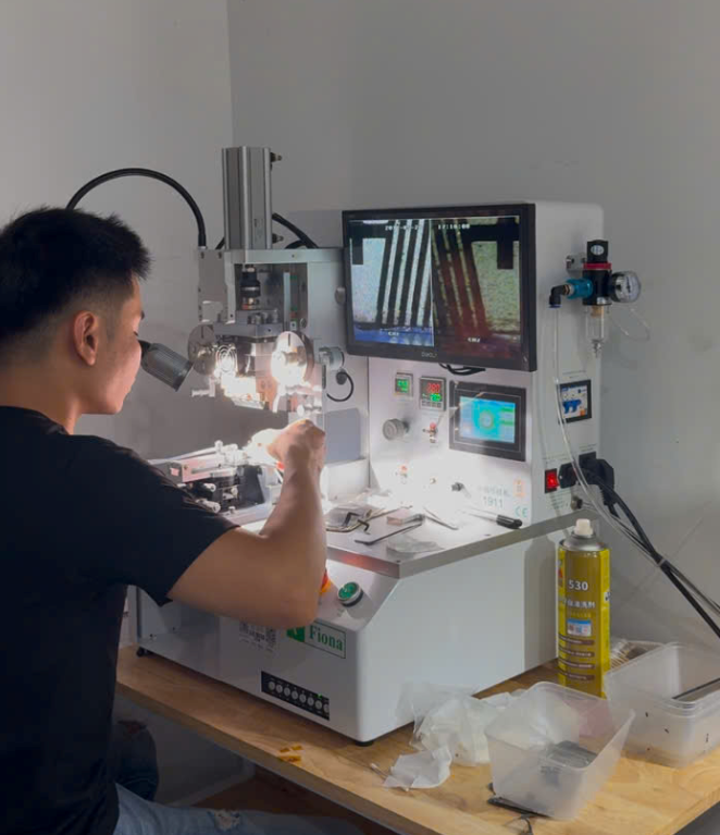 Kỹ thuật viên sẽ bóc tách đoạn cáp lỗi khỏi tấm nền OLED.